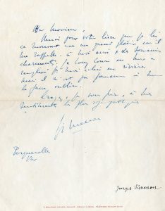 SIMENON, Georges (1903-1989), écrivain belge. Lettre autographe signée à Pierre-Victor Stock (1861-1943), éditeur français, datée de Porquerolles, le 11 juin 1937 (cachet de la poste), 1 p. 4° à l'adresse du 7, Bd Richard Wallace, enveloppe...