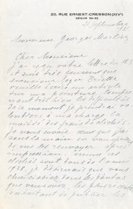 heureux d'apprendre que « Monsieur Roger Brielle » (1899-1960), artiste et critique d'art français, prépare un article sur lui. Comprenant « les difficultés de ce moment », il prend à sa charge les clichés et lui demande de choisir dans les photos qu'il envoie. L'article est paru dans le n° 8-9 de 1931 des « Cahiers de Belgique ».