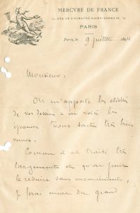 VALLETTE, Alfred (1858-1935), homme de lettres français, fondateur et directeur du « Mercure de France ». Une lettre autographe signée (Paris le 9 juill. 1894, 2 p. 8°) et un carte postale autographe signée (Paris le 26 sept. 1911) à Charles...
