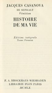 CASANOVA DE SEINGALT (Jacques). Histoire de ma vie. Wiesbaden, F.A. Brockhaus ; P., Plon, 1960-1962, 12 tomes reliés en 6 vol. in-12, pleine peau souple rouge édit., dos ornés de motifs dorés, tranches dorées. Edition en grande partie originale,...