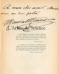 MAINDRON (Maurice). L'Arbre de la science. P., Lemerre, 1906, 8°, br. Edit. orig. Ex. du tirage courant après 25 sur Hollande. Envoi de l'auteur. Non coupé./ IDEM. Blancador l'Avantageux. P., édit. de la Revue Blanche, 1901, 8°, br. Edit. orig....