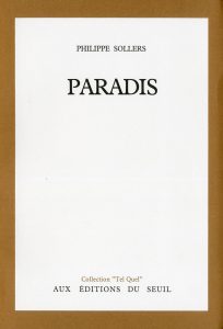 SOLLERS (Philippe). Paradis. P., Seuil, 1981, 8°, br., non coupé. Edit. orig. 1/35 ex. num. sur papier offset sirène de Sainte-Marie et parmi ceux-ci 1/30 num. en chiffres arabes. Célèbre roman de Sollers qui fut édité sans aucune ponctuation.