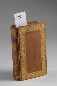 large roulette dorée encadrant les plats, filet doré sur les coupes, roulette dorée intérieure, tranches dorées. Reliure signée de Lesné en pied au dos (à froid). Mors fendus, la charnière du premier plat faible, coiffes arrachées, coins émoussés. Frontispice h.-t. gravé à l'eau-forte, IV- 884 pp., texte sur 2 colonnes imprimé en caractères microscopiques. Exemplaire du prince Roland Bonaparte, avec son ex-libris gravé au contreplat. Belle reliure, malheureusement endommagée, de Lesné (1777-1841), relieur de Louis XVIII et auteur de l'une des premières études importantes sur l'art de la reliure. Serrurier, Lesné quitta son métier à 27 ans pour exercer celui de relieur, que, disait-il, il avait appris seul. En 1820 publia « La Reliure », poème didactique en six chants .