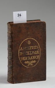 dorée dans un ovale accompagnée de fleurons sur le plat sup. « Archives du Clergé de France ». Arrest de la cour du Parlement séant à Aix (...) Le Blanc de Castillon (...) cet extrait imprimé sera lacéré et brulé... Aix, David 1766, 81 pp. // Arrest de la cour de Parlement de Bordeaux qui ordonne que l'imprimé ayant pour titre Instruction (...) sera lacéré et brulé, Bordeaux Chappuis 1766, 54 pp. // Monitoire à publier dans la capitale de la Provence, 34 pp. // Discours d'un des messieurs des Enquêtes au Parlament au sujet d'un ecrit intitulé Monitoire... 12 pp. (1766) // Arrest de la cour de parlement des aydes et finances de Dauphiné qui condanne au feu l'extrait du discours de M. Castillon, Greboble 1766, 1 1 pp. // Arrest de la cour de Parlement d'Aix, 1765, 56 pp. // Arrest de la cour de Parlement de Toulouse qui ordonne que deux libelles (...) seront lacérés et brulés, Toulouse 1766, 16 pp. // Arrest de la cour de parlement de Provence, Aix David, 1768, 240 pp.