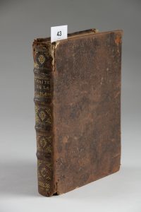 veau brun, dos à nerfs orné de caissons dorés. Reliure de l'époque défraîchie, coins usés, coiffes arrachées avec petits manques au dos, plats frottés. (12) ff., 400 pp., (1) f. Quelques rousseurs et qq. cernes marginaux. Edition originale. Saffroy, 8705