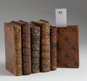 cette ville, Paris, De Bure, 1755 (in-12, veau marbré, dos à nerfs orné, un mors fendu, coiffe sup. absente, frontispice gravé) - Idem, 3ème édition, 1768 (in-12, veau marbré de l'époque, dos à nerfs orné, coiffes restaurées, dos fané) - Brice, Description nouvelle de ce qu'il y ade plus remarquable dans la ville de Paris, seconde édition, 1687 (in-12, veau brun jaspé de l'époque, dos à nerfs orné, coiffe sup. accidentée) - Piganiol de La Force, Nouvelle description des châteaux et parcs de Versailles et de Marly, 1717 (in-12, veau jaspé de l'époque, dos à nerfs orné, manquent les planches) - Dulaure, Nouvelle description des curiosités de Paris, 1787 (2 vol. petit in-12, basane marbrée de l'époque, reliures restaurées, dos fanés).