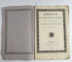 Gillé Epreuves des vignettes et fleurons gravés sur bois et polytipés, des fonderie et imprimerie de Gillé, Rue Saint-Jean-de-Beauvais, n°18. Paris, Gillé fils, 1808. Brochure in-folio, couv. muettes rose pâle ornées d'un encadrement...