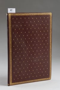 République ; imprimé par ordre de la Convention nationale par les soins de L. Langlès, sous-garde des manuscrits de la Bibliothèque nationale pour les langues Arabe, Persane, Tartare-mantchou, &c. Paris, Imprimerie de la République, an lii (1795). 1 vol. in-folio, maroquin brun bradel souple, plat sup. richement orné d'un décor oriental doré formé d'encadrements de roulettes, de fleurons, et d'écoinçons aux angles de l'encadrement intérieur, fleuron à froid au centre, plat inférieur orné d'un treillis losangé à froid semé d'étoiles à cinq branches aux intersections, le tout encadré d'une roulette dorée. Reliure moderne. (12) ff., texte en français face au texte arabe. Quelques brunissures angulaires dans les marges en début de volume, qq. rousseurs. « Impression qui sera regardée chez toutes les nations comme un précieux et curieux monument de l'Art typographique » comme on peut le lire sous la plume de Aubin-Louis Millin de Grandmaison dans le Magazin encyplopédique de 1795... Ce texte important dans l'histoire de la Révolution française, rédigé par Cambacérès, Lozeau, Pelé, Eschasseriaux jeune, Boissy et Guyomard, marque la fin de la Terreur et le rétablissement des libertés. Le décret qui s'ensuivit (imprimé à la suite de l'adresse) stipule que ce texte sera imprimé et envoyé à tous les districts et traduit dans toutes les langues. La traduction en arabe fut confiée à P. Ruffin, secrétaire de l'ambassadeur de France à Constantinople et la publication fut confiée à Louis Langlès, conservateur des manuscrits orientaux à la Bibliothèque nationale. Cette publication est l'occasion de la résurgence des fameux caractères arabes dont les poinçons avaient été fabriqués aux frais de François Savary de Brèves quand il prit ses fonctions d'ambassadeur à Rome à partir de 1608. Le premier livre imprimé en arabe à l'aide de ces remarquables caractères sortit de la typographia savariana en 1613. Après maintes tribulations, les matrices de ces poinçons enrichirent les collections du roi de France, aux côtés des caractères grecs de Garamond. Il furent utilisés plusieurs fois au xviie s. mais avaient sombré dans l'oubli. Le renouveau des études orientales à la fin du XViiie siècle (l'Ecole des Langues orientales fut fondée le 2 avril 1 795 par décret de la Convention) fut l'occasion de la redécouverte de ce trésor typographique. L'impression de ce livret qui s'ouvre de droite à gauche, est bilingue, le texte arabe faisant face au texte français. Le feuillet d'incipit en arabe est imprimé en rouge et noir dans un bel encadrement gravé de style néo-arabe. Les mots "Convention nationale" ne sont pas traduits mais translitérés en lettres arabes. Pour le reste, le texte français est entouré d'une frise typographique en noir et le texte arabe, d'une frise à motifs de grecques en rouge. Les trésors de l'Assemblée Nationale, cat. d'exposition, 2005, p. 38; Balagna, L'imprimerie arabe en occident, pp. 122-124.