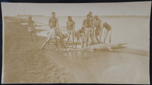[Afrique] Prise d'un crocodile par un groupe d'hommes et d'enfants au bord d'un cours d'eau. Vers 1860. Epreuve sur papier salé (16 x 28,4 cm). Un peu tombée.