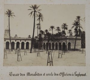 [Algerie] Bazar des Mozabites et cercle des officiers à Laghouat. Vers 1860-1865. Epreuve sur papier albuminé (18,2 x 25,5 cm) collée sur carton, légende à l'encre noire calligraphiée en caractères gothiques. Bon tirage.