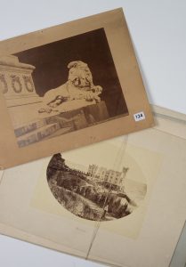[Italie] Ensemble de 5 photographies : Cannobio Lac Majeur, Le château de Miramar proche de Trieste, 2 vues urbaines non identifiées, N.B. Napoli Colonna dei Martiri, Lion en marbre. Vers 1870-1880. 5 photographies sur papier albuminé, grand format.