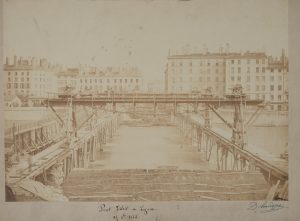 Laudoyer (D.) Pont Tilsit à Lyon. 25 octobre 1863. Photographie sur papier salé (env.31 x 44,5 cm.) collée sur carton. Tombée, petites taches.