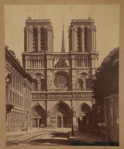 [Paris] Vue de la façade de Notre-Dame de Paris (après les travaux de Viollet-le-Duc). Vers 1870. Epreuve sur papier albuminé (26,3 x 21,2 cm) collée sur carton. Retouche à l'encre en bas à droite.
