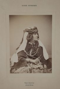 Portier (C.) Portrait de femme en costume traditionnel. « Algérie pittoresque. Types algériens (Ouled Naïls) » Vers 1880. Epreuve sur papier albuminé (22,4 x 16,5 cm), collée sur carton (légende et signature imprimées). Beau tirage.
