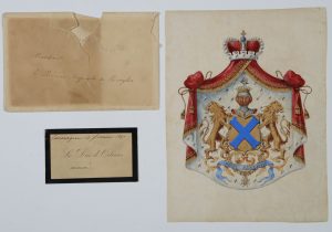 [Broglie (Famille de)] Blason de la famille de Broglie-Revel. xixe s. Enluminure sur vélin (234 x 178 mm). On joint un billet de remerciement du duc d'Orléans sur carte de visite adressé au prince Auguste de Broglie (12 février 1890). Enveloppe...