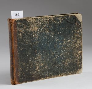 [Manuscrit] / [Calligraphie] Romances, Chansons, Sauvage. Vers 1860. 1 vol. in-8° oblong, demi-basane brune usagée, coins émoussés. 87 feuillets calligraphiés à l'encre noire, rouge, verte, jaune et brune sur papier vélin fort. Chaque...