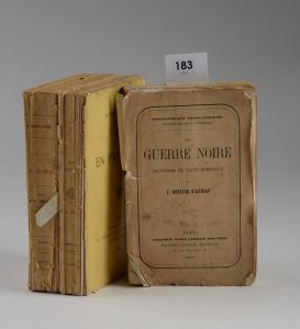 Berlioz d'Auriac (J.) La Guerre noire. Souvenirs de Saint-Domingue. Paris, Putois-Cretté, 1862. 1 vol. in-12 br. Couverture détachée, qq. ff. écornés. On joint : Tissot : Voyage au pays des Tziganes (La Hongrie inconnue). Paris, Dentu, 1880....