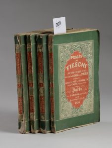 [Fieschi] Procès de Fieschi et de ses complices, devant la cour des Pairs, précédé des faits préliminaires et de l'acte d'accusation. Paris, Ernest Bourdin, 1836-1837. 2 tomes en 4 vol. in-8° brochés, couvertures gravées polychromes. Quelques...