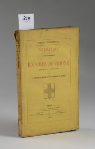 [Génealogie] / Gourdon de Genouillac / Piolenc (Marquis de) Nobiliaire du département des Bouches-du-Rhône. Histoire - Généalogies. Paris, 1863. 1 vol. in-8° broché, couv. jaunes impr. en rouge et noir, accrocs au dos. Bon exemplaire. (2) ff.,...