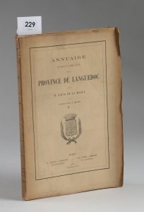 La Roque (Louis de) Annuaire historique et généalogique de la province de Languedoc. Paris, 1864. 1 vol. in-8° br., (4) ff., 174 pp., (1) p., blasons gravés sur bois dans le texte.