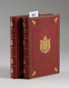 encadrement d'un filet doré et d'un filet à froid sur les plats, armes impériales dorées au centre, chiffres dorés couronnés dorés aux angles, roulette dorée sur les coupes, dentelle dorée intérieure, gardes de moire verte, tranches dorées. Reliure de l'époque signée de L. Despierres, relieur de l'Empereur. Très bel exemplaire dans une jolie reliure de Despierres aux armes de Napoléon Iii. Les deux premiers columes (sur 32) de cette publication non mise dans le commerce, ordonnée par Napoléon Iii. Vicaire Vi, 30.