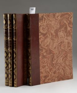 tête-de-nègre, dos à nerfs ornés de caissons dorés. Reliures de l'époque. Bel exemplaire. (5) ff., Vi-56 pp., 72 pp., 68 pp., 44 pp.; (4) ff., 47 pp., (1) p., 54 pp., (1) p., 59 pp., (1) p.; 58 pp., (1) p. 764 illustrations gravées sur bois dans le texte et 92 planches hors-texte (dont 68 chromolithographies et 24 plans) et 22 calques imprimés. Textes par Ed. Fournier, Paul Lacroix, A. de Montaiglon, A. Bonnardot, Jules Cousin, Franklin, Valentin Dufour etc. Bel exemplaire très frais malgré quelques petites rousseurs. Raccommodage en marge d'un feuillet de texte au tome Ii.