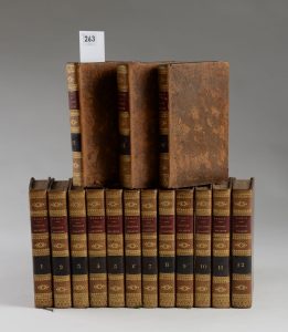 Rollin (Charles) Œuvres complètes de Rollin. Nouvelle édition, accompagnée de notes et d'éclaircissements historiques par M. Bousson et Mairet. Lons-le Saunier, 1826. 15 vol. (sur 16) in-12, basane blonde racinée, dos lisses ornés de filets et...