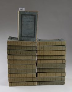 Saint-Simon. Paris, A. Sautelet et Cie, 1829-1830. 21 vol. in-8° brochés, couv. impr. bleues. Dos insolés, qq. éclats. Mais bel exemplaire dans l'ensemble. Première édition complète des Mémoires de Saint-Simon. « Cette première édition authetique, publiée par le général de Saint-Simon lorsqu'il eut récupéré l'intégralité du manuscrit des Mémoires, constitua le plus gros succès de librairie depuis Walter Scott » (Formel). Vicaire Vii, 1 01 ; Formel, Mv-1 .