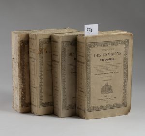 [Touchard-Lafosse (G.)] Histoire des environs de Paris. Paris, Philippe, 1837. 4 vol. in-8° br., couv. impr. grises. Manque le dos du tome Iv (couv. défraîchie). Avec 1 grande carte h.-t. repl. et 64 (sur 68) gravures hors-texte. Quelques ff....