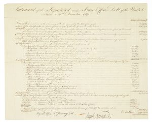 NOURSE, Joseph “Statement of the liquidated and loan office debt of the United Stated to 31st Dec. 1787" Document signé Philadelphie, Registered Office, 1er janvier 1788 1 p. in-folio, encre brune