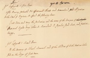 DEUX TOASTS EN MÉMOIRE DU SIÈGE DE YORKTOWN. EXEMPLAIRES DE LAFAYETTE, TOUJOURS A LA TROISIÈME PERSONNE. TWO TOASTS IN THE MEMORY OF THE SIEGE OF YORKTOWN. LAFAYETTE’S COPIES, IN THE THIRD PERSON “Gal Lafayette’s first toast. After having presented his affectionate thanks and remembered his obligation to the state of Virginia, he offered the following toast : Yorktown and may the pretentions and the arms of the insurgees of national rights every (?) when be surrendered to popular good sense and patriotic energy Gal Lafayette’s second toast. To the memory of Colonel Scammel and of the soldiers of both nations who fell on the Siege of Yorktown" Alexander Scammell (1747-1781) was wounded on September 30, 1781 near Yorktown and subsequently died on October 6 in Williamsburg, Virginia making him the highest ranking American officer killed during the Siege of Yorktown. “Lafayette was conducted amid the acclamations of the people, to the head quarters prepared for him. It was in the very house that Cornwallis inhabited during the siege of Yorktown, forty-three years previous. Yorktown, which has never recovered from the disasters of the Revolutionary war, because its unhealthy situation prevented the access of new inhabitants, appeared from its actual condition very properly adapted to the celebration which was to take place the following day : houses in ruins, blackened by fire, or pierced by bullets ; the ground covered with fragments of arms, the broken shells, and overturned gun-carriages" (Levasseur, Lafayette in America, I, p. 183)