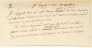 TOAST PRONONCÉ EXEMPLAIRE DE .À ANNAPOLISLAFAYETTE. TOAST IN ANNAPOLIS. LAFAYETTE’S COPY “Gal Lafayette’s toast. Gal Lafayette rose and after having offered his more respected and affectionate thanks for the honors and marks of kindness confered upon him, he gave the following toast : the state of Maryland and may be fulfilled all the patriotic wishes which its respected representations on this day given me so honorable and gratifying an opportunity to export" “Another corps of militia had marched from Nottingham, which is thirty miles from Annapolis. The storm had retarded its arrival, but had not damped the zeal of the citizens. At Carrol’s Lane, about two miles from the city, the general, notwithstanding the remontrances that were made, descended from the carriage, and with his head uncovered, returned thanks to the troops" (Levasseur, Lafayette in America, II, p. 21)