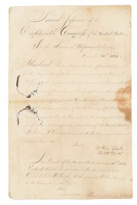[LAFAYETTE, Gilbert du Motier, marquis de]. Document signé par Mathieu StClair, Clerk of the House of Representatives, et par Charles Cutts, Secretary of the Senate Washington, “House of Representatives", 30 décembre 1824 1 p. folio, quelques...