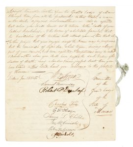[LAFAYETTE, Gilbert du Motier, marquis de] Lettre signée par neuf membres de la Grand Lodge of Maine Portland, 25 juin 1825 2 pp. in-4, ruban de soie bleue