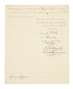 EXEMPLAIRE DE LAFAYETTE, QUI EST INVITÉ PAR LA GRANDE LOGE DU DELAWARE : “YOUR MASONIC BRETHREN" Lafayette est invité à une “Special Communication" qui se tiendra au “Grand Lodge room in the Borough of Willington (...) to receive those attentions and civilities which it will become every class and discription of our citizens, and more especially your masonic brethren, to bestow on so distinguished a guest" ; on lui annonce qu’il deviendra membre de la loge.
