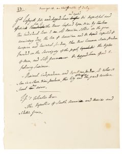 TOAST PRONONCÉ À NEW YORK LE 4 JUILLET 1825. EXEMPLAIRE DE LAFAYETTE. TOAST IN NEW YORK ON 4th JULY, 1825. LAFAYETTE’S COPY “Gal Lafayette rose and expressed his respectful and affectionate sense of the honor conferred upon him by the individual toast to an old American soldier on the great anniversary day, of American and, he expected, of European and universal freedom, that new common state freedom founded on the sovereignty of the people, the rights of men, and self government. He afford the following sentiment : National independence and republican freedom : to what it can produce, this city of New York and the grand western canal may assure. L.F.’s volunteer toast. The Republics of South America and Mexico and Greece" “At Whitehall we were told of the boast of the English general, and we now found ourselves on the field of battle which humbled his pride ; we should have been exceedingly pleased to visit this theatre of one of the most-glorious events of the Revolution ; but the night was too far advanced (^) and some hours afterwards the sun of the Fourth of July rose radiantly to illuminate the 49th anniversary of the declaration of independence (^) The sermon, the subject of which was the solemnity of the day, was followed by the reading of the declaration of independence, which was listened to with profound attention" (Levasseur, Lafayette in America, II, p. 215)