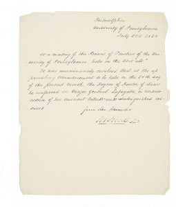 LA FIN DU FAREWELL TOUR. EXEMPLAIRE DE LAFAYETTE. “DEGREE OF DOCTOR OF LAWS CONFERRED ON MAJOR GENERAL LAFAYETTE" “At a meeting of the Board of Trustees of the University of Pennsylvania (...) it was unanimously resolved that (...) on 28th Day of the present month (...) the Degree of Doctor of Laws be conferred on Major General Lafayette, in consideration of his eminent talents and distinguished services" Lafayette had written to Joseph Reed, Jr., from New York, the previous September, looking forward to meeting him (Gottschalk, Guide, p.187).