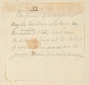 TOAST PRONONCÉ À WILMINGTON, EN L’HONNEUR DE BRANDYWINE, LA PREMIÈRE BATAILLE À LAQUELLE A PARTICIPÉ LAFAYETTE. EXEMPLAIRE DE LAFAYETTE. TOAST IN WILMINGTON, IN THE HONOR OF BRANDYWINE, THE FIRST BATTLE LAFAYETTE FOUGHT. LAFAYETTE’S COPY “the burrough of Wilmington and may the Brandywine, after having been a bloddy dispute between the soldiers of liberty and the satellites of oppression" (...) “Although the heat continued excessive, he undertook, on the 25th, his journey to Wilmington, where a great number of Pennsylvanians and Virginians were in waiting to conduct him to the field of the battle of Brandywine. This field was not rendered illustrious by a victory, as has been said, but its remembrance is not less dear to Americans, who gratefully recollect the blood spilled there by their fathers, and by young Lafayette, in the defence of their rights, and to secure their independence" (Levasseur, Lafayette in America, II, p. 234)