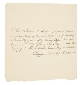 [LAFAYETTE, Gilbert du Motier, marquis de] Lettre autographe de Mme Mildred T. Thompson Culpeper, 22 août 1825 1 p. in-4