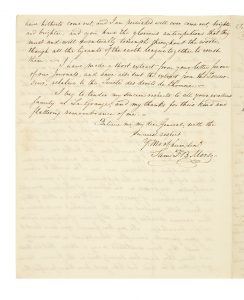 TRÈS BELLE LETTRE DE SAMUEL MORSE AU GÉNÉRAL LAFAYETTE : IL PARLE DU MUSICIEN ITALIEN PIETRO MARONCELLI, DES PRISONS DE SYLVIO PELLICO, DE LEUR AMI FENNIMORE COOPER, ET DE LA POLITIQUE AMÉRICAINE. LA LETTRE SE CLÔT SUR L’ÉLOGE DES PRINCIPES RÉPUBLICAINS ET DE LA LIBERTÉ, DONT LAFAYETTE EST LE HÉROS, ET QUE SEULS LES ÉTATS-UNIS PORTENT ENCORE : “YOU HAVE LIVED TO SEE YOUR FAVORITE PRINCIPLES TRIUMPHANT IN ONE COUNTRY AT LEAST" “Your obliging letter of the 5th Nov. just arrived finds me confined to the rouse by a temporary lameness" ; il le remercie de lui avait présenté le “popular signor Maroncelli" qu’il a présenté à son Club “which meets weekly and of which Mr Galladin, Mr Jay, Chancelleor Kent, the Professors of Columbia College, are members" ; Morse parle de Sylvio Pellico et de son emprisonnement ; il félicite Lafayette pour la guérison de son petit-fils Lasteyrie et pour l’entrée d’Oscar de Lafayette ,à l’École Polytechnique “tell him he must ,his name cannot be hid ,that the world will have its eye on him ,my dear General Morse annonce à ; sustain it in all his glory” Lafayette l’arrivée de Fennimore Cooper “my excellent and distinguished friend (...) is about replying to the attacks made upon him while absent and his pamphlet will make an exposé of the finance discussion in Paris" ; il lui annonce l’envoi de plantes greffées et d’arbres qu’il lui fait envoyer en France et refuse de lui expliquer la situation politique aux U.S.A. : “I cannot identify myself with either of the present parties but I am rather a looker-on" suivent de beaux propos sur l’inanité des oppositions politiques, “Yet the solid, substantial enterprising, active majority of the people are not moved by verbiage, or rhetorical figure ; they read and calmy digest the arguments pro and con" ; il condamne une “absence of religious principles and a prevalence of ignorance (...) No, my dear General, you have lived to see your favorite principles triumphant in one country at least, they have withstood many a storm that has threatened them ; they have been severely tried in the furnace, and are yet further to be tried, but like gold seven times purified, they have hitherto come out, and I am persuaded will ever come out, brighter and brighter (...) I have made a short extract from your letter for one of our Journals and have also sent the extract from the Precurseur, relative to the Société des droits de l’homme" Pietro Maroncelli (1795-1846) est un patriote, musicien et écrivain italien connu pour avoir été le compagnon de prison de Silvio Pellico. En 1832, il s’exile en France où il adhère au socialisme utopique de Charles Fourier. En 1833, il se rend à New York sur invitation du librettiste de Mozart, Lorenzo Da Ponte, qui a fondé le premier opéra d’Amérique. À New York, Maroncelli enseigne la musique et diffuse les idées socialistes de Fourier. Dans les dernières années de sa vie, il a pour ami Edgar Allan Poe. RÉFÉRENCE : les archives de Samuel F. B. Morse sont en grande partie conservées à la Library of Congress. S’y trouve la lettre de Lafayette du 5 novembre 1833 à laquelle celle-ci fait réponse.