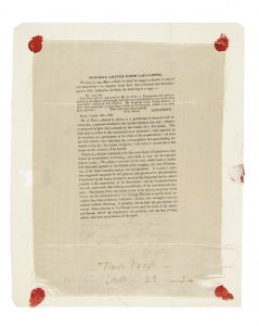 LAFAYETTE’S FAN CLUB : LETTRE DU GÉNÉRAL IMPRIMÉE SUR SOIE ET ENVOYÉE PAR UN ADMIRATEUR AU GÉNÉRAL LUI-MÊME Lettre imprimée sur soie et contrecollée par quatre points de cire sur une feuille de papier, avec cachet du port du Havre au verso et suscription de l’adresse parisienne du Général de Lafayette, cachets de cire rouge