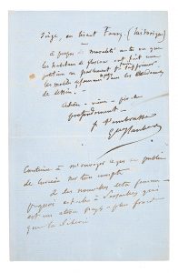 POURSUITE DE L’ÉCRITURE DE SALAMBÔ ET MÉDIOCRITÉ DES TEMPS MODERNES :“JE SUIS EFFRAYÉ, ÉPOUVANTÉ, SCANDALISÉ PAR LA COUILLONNADE TRANSCENDANTE QUI RÈGNE SUR LES HUMAINS" 4 pages in-8 (210 x 134mm), sur papier vergé bleu, à l’encre noire. Quelques ratures PROVENANCE : Catalogue de la librairie Georges Andrieux, Hôtel Drouot, 30-31 mai et 1er-2 juin 1928, n° 202 ; enveloppe de la vente conservée “J’ai enfin terminé mon interminable quatrième chapitre, d’où j’ai retranché ce que j’en aimais le mieux. Puis, j’ai fait le plan du cinquième, pris des notes en quantité, etc. [...] Oui, je trouve, contrairement au sieur d’Aurevilly, qu’il s’agit maintenant d’hypocrisie et pas d’autre chose. Je suis effrayé, épouvanté, scandalisé par le couillonnade transcendante qui règne sur les humains. A-t-on peur de se compromettre !!! Cela est tout nouveau, à ce degré du moins. L’envie du succès, le besoin de réussir quand même, à cause du profit, a tellement démoralisé la littérature qu’on devient stupide de timidité [...] Tout cela n’est pas perdu. A mesure que je me plonge plus avant dans l’antique, le besoin de faire du moderne me reprend, et je cuis à part moi un tas de bonshommes [...] J’ai plusieurs idées sur ton style [...] Il faudra que ce soit impersonnel." RÉFÉRENCE : Gustave Flaubert, Correspondance, III, Paris, Gallimard, 1991, pp. 26 et 1048
