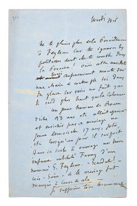 FLAUBERT RACONTE À FEYDEAU UNE ANECDOTE AMUSANTE, ET L’ENTRETIENT DE L’AVANCÉE DE SALAMBÔ 4 pages in-8 (210 x 132mm), sur papier vergé bleu, à l’encre noire. Quelques ratures PROVENANCE : Catalogue de la librairie Georges Andrieux, Hôtel Drouot, 30-31 mai et 1er-2 juin 1928, n° 204 ; enveloppe de la vente conservée “un jeune homme de Rouen, riche, vingt-trois ans, etc. allait épouser et enrichir par ce mariage, une jeune demoiselle, dix-sept ans, jolie, etc. lorsqu’un jour il surprit, dans sa table à ouvrage, un livre infâme intitulé : Fanny, d’un nomme E. Feydeau ! Scandale ! cris, scène ! et le mariage fut manqué à cause de cela [...] j’étais tellement enthousiasmé de ce jeune bourgeois que j’éprouvais tour à tour le besoin de lui faire frapper une médaille en aluminium - et de l’écorcher vif [...] le positif, c’est que ton bouquin a fait rompre un mariage et il est probable qu’en cela il a fait une bonne action !" [...] “pour qu’on dise d’un personnage antique : “c’est vrai", il faut qu’il soit doué d’une triple vie, car le modèle, le type, qui l’a vu ? J’espère dans un mois avoir fini mon VIe chapitre et, avant de rentrer à Paris, le VIIe sera fait, il le faut. Je me suis débarrassé du Ve par la suppression de deux morceaux excellents, mais qui ralentissaient le mouvement" RÉFÉRENCE : Gustave Flaubert, Correspondance, III, Paris, Gallimard, 1991, p. 38