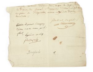 LE GÉNÉRAL EN CHEF BONAPARTE PENDANT LA CAMPAGNE D’ITALIE : PIÈCE AUTOGRAPHE SIGNÈE INÈDITE. LES DOCUMENTS CONCERNANT CETTE PÉRIODE SONT RARES 1/2 page in-folio (177 x 210mm), à l’encre brune. Ordre concernant les subsistances de l’armée d’Italie, signé de Villemanzy, sur lequel Bonaparte a apposé trois lignes autographes et sa signature : “la division du général Baraguey d’Hilliers doit être nommée pour le Frioul. Le général en chef, Bonaparte" Le document d’origine a été déchiré sans doute pour être réutilisé. Jacques Pierre Orillard de Villemanzy fut nommé commissaire ordonnateur en chef à l’armée d’Italie qu’il ne rejoint qu’au début de 1797. Louis Baraguey d’Hilliers fut nommé général de division le 10 mars 1797 et commanda une division dans le Frioul au moment où Bonaparte entra par ce chemin en Autriche, au printemps 1797. RÉFÉRENCE : ne figure pas dans la nouvelle édition de la Corr. générale
