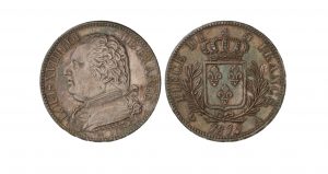LOUIS XVIII (1815-1824). 5 francs buste habillé, 1815 Paris. G 591. Superbe, revers à fine patine iridescente.