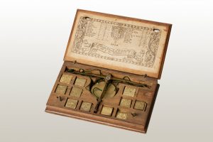 BRUXELLES. Belle boîte datée 1758 par J. Delmotte "fraiseur et adiusteur juré de poid et de balance" avec 5 poids lamellaires et 18 dénereaux chiffrés au St Georges terrassant le dragon au-dessus de "BRUX" (sauf un, non d'origine).