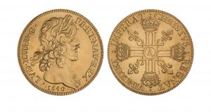 REPRODUCTION MONNAIE de PARIS. Lot de 2 reproductions en or 920/1000, dans leur écrin : ange d'or de Philippe VI de Valois (11g) et dix louis de Jean Warin pour Louis XIII (40 g). Les 2, superbes.