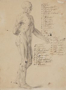 LOT DE DESSINS. c. 1900. - Carnet de croquis contenant 30 études de nus. Sanguine. Non signés. - Un écorché à la mine de plomb avec notice à l'encre. Non signé. - 6 gravures de figures mythologiques coloriées.
