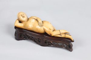 DOCTOR'S LADY. Fin XVIIIe, avec socle : 6 x 3,5 x 14 cm, ivoire, bois. Élégant mannequin en ivoire sculpté, représentant une femme se reposant sur un socle en bois. Son visage est serein. Ses cheveux longs sont rassemblés en haut et en arrière...