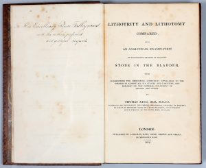 KING (Thomas). Lithotrity and lithotomy compared. London, Longman, 1832, in-8, XIV-[2]-320-[2] pages, 3 planches dépliantes, veau tabac de l'époque, dos à nerfs fleuronnés, pièce de titre rouge, roulettes à froid et filet doré en encadrement...